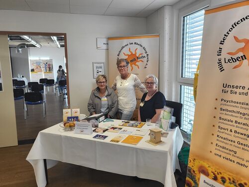Die neue Vorsitzende Beate Schoenen nahm die Gelegenheit gerne wahr, zusammen mit Resi Bauer-Kocar und Ute Berger den Verein zu repräsentieren. Schnell kamen die Drei mit den Besucher*innen in Kontakt und konnten die gerade neu aufgelegten Flyer verteilen. Auch die Angestellten der Reha sowie die vor Ort tätigen Psychologen und Therapeuten waren sehr interessiert und informierten sich über die Leistungen und Angebote des Vereins. Insgesamt wurden gute Gespräche geführt und die geknüpften Kontakte werden weiter ausgebaut.