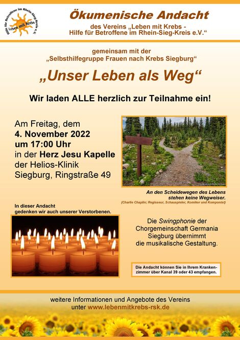 Wir feiern diesen Gottesdienst für alle Mitglieder unseres Vereins, die Angehörigen und Freunde gemeinsam mit der Selbsthilfegruppe Frauen nach Krebs in Siegburg.