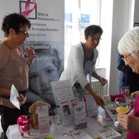 An den Ständen informierten Elke Schaar (Dipl. Ernährungsberaterin), Frau Tehrani (Screeningeinheit Bonn Rhein-Sieg, Euskirchen) und Frau Christiane Karlowsky, Dipl.Psych. Auch gab es je einen Infotisch des "BRCA-Netzwerks" und des Vereins "Leben mit Krebs."