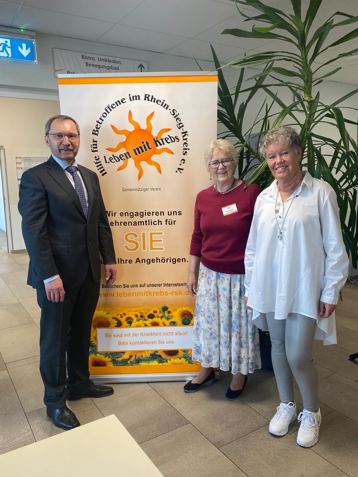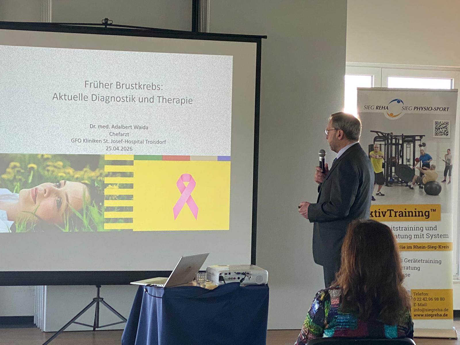 Um 14.30 Uhr hielt Herr Dr. med. Adalbert Waida, Chefarzt der Frauenklinik GFO Kliniken Troisdorf, einen Vortrag zum Thema: „Früher Brustkrebs – aktuelle Diagnostik und Therapie“. Er ließ es sich nicht nehmen zum Abschluss seines Vortrages bei uns am Stand vorbeizukommen.